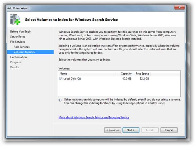 Bij het selecteren van de stations die Windows moet indexeren, moet u er rekening mee houden dat hoe meer stations u selecteert, hoe langer het duurt om de index op te bouwen, die bepaalt hoelang de prestaties worden beïnvloed. Omdat we maar één schijf hebben, zullen we deze selecteren en op Volgende klikken en vervolgens installeren om het proces te voltooien.