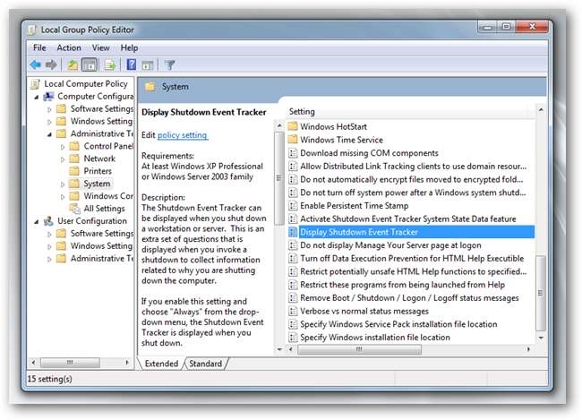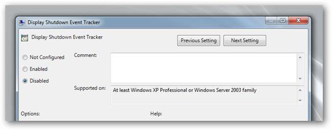 Blader vervolgens aan de rechterkant naar beneden tot je de instelling vindt met de naam Display Shutdown Event Tracker