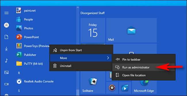 Als u een Windows 10-app wilt uitvoeren als beheerder, opent u het menu Start en zoekt u de app in de lijst. Klik met de rechtermuisknop op het pictogram van de app en selecteer vervolgens "MEER" in het menu dat verschijnt. Selecteer in het menu "MEER", selecteert u "Uitvoeren als beheerder".