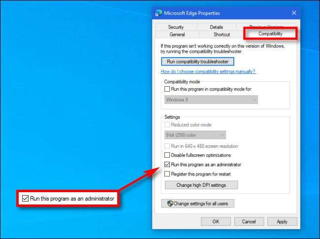 Als u ook een app als beheerder wilt uitvoeren, maakt u een snelkoppeling naar de app op uw bureaublad of taakbalk of in File Explorer. Klik met de rechtermuisknop op de snelkoppeling en selecteer "Eigenschappen". Klik in het venster Eigenschappen dat verschijnt op het tabblad "Compatibility" en vervolgens Zet een vinkje naast "Voer dit programma uit als beheerder."
