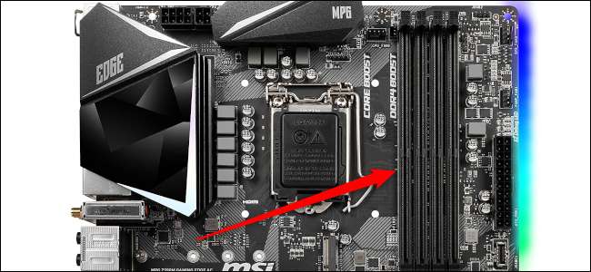 Ondertussen zijn rechts naast de CPU-aansluiting een andere set slots voor RAM-modules. Er zijn typisch twee of vier RAM-slots, afhankelijk van de grootte en het prijsniveau van uw moederbord. Dan, rond de randen van het bestuur, heb je SATA-connectoren voor harde schijven en 2,5-inch SSD's en een 24-pins vermogensbezorgpoort die verbinding maakt met de voeding van de pc.