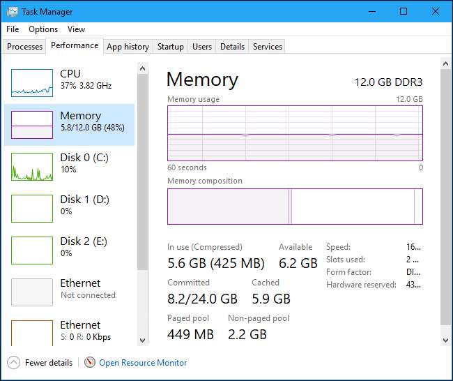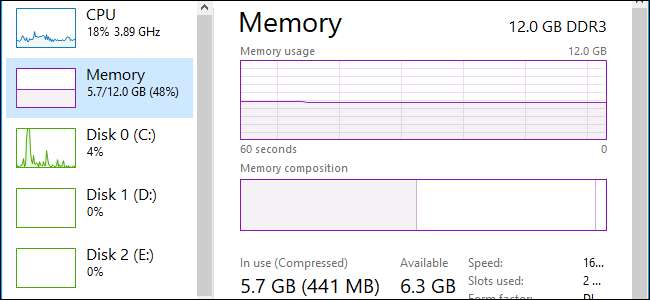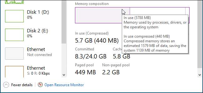 Windows 10 gebruikt geheugencompressie om meer gegevens in het systeemgeheugen op te slaan dan anders mogelijk zou zijn. Als u Taakbeheer bezoekt en de details van uw geheugengebruik bekijkt, zult u waarschijnlijk zien dat een deel van uw geheugen "gecomprimeerd" is. Dit is wat dat betekent.