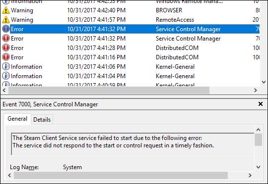 In de onderstaande afbeelding kunt u bijvoorbeeld zien dat er een fout is gegenereerd toen de Steam Client-service niet op tijd kon worden gestart. We hebben echter geen problemen gehad met de Steam-client op de testcomputer, dus het is waarschijnlijk een eenmalige fout die zichzelf corrigeerde bij een volgende start.
