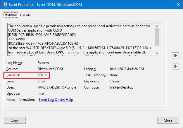 U kunt ook specifieke gebeurtenis-ID's online opzoeken, zodat u informatie kunt vinden die specifiek is voor de fout die u tegenkomt. Dubbelklik gewoon op de fout in Logboeken om het eigenschappenvenster te openen en zoek naar het item "Gebeurtenis-ID".