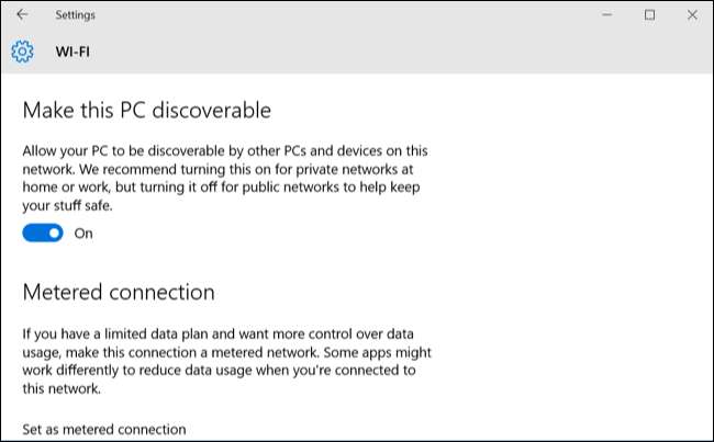 U ziet een aantal opties voor elk wifi- of Ethernet-netwerk waarmee u momenteel bent verbonden. De optie "Maak deze pc vindbaar" bepaalt of een netwerk openbaar of privé is. Zet het op "Aan" en Windows zal het netwerk als privé behandelen. Zet het op "Uit" en Windows zal het netwerk als een openbaar netwerk behandelen.