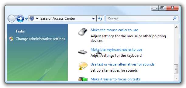 Open het Configuratiescherm en ga naar het Toegankelijkheidscentrum. U zou een link moeten zien voor "Het toetsenbord gebruiksvriendelijker maken", waarop u wilt klikken.