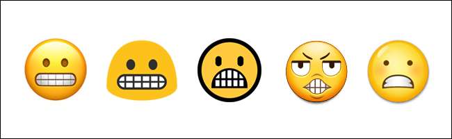 Maar andere symbolen, zelfs als het lijkt alsof ze duidelijk zouden moeten zijn, zijn niet zo duidelijk. Dit is hoe U + 1F62C, het 'Grimacing Face' eruitziet op verschillende platforms.