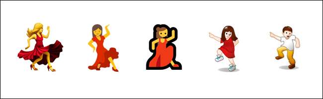 In vroege versies van de emoji Unicode-set was de emoji voor "danser" bijvoorbeeld ofwel een sekseneutraal stokpoppetje of een dansende cartoonmannetje. Later werd diezelfde emoji-code door elkaar geschud in een herziening van de standaard, dus op apparaten met de nieuwere versies is het geen stokfiguur of man, maar een vrouw in een rode salsa-jurk. Hier is hoe die ene emoji enorm kan variëren, afhankelijk van de leeftijd van de telefoon en het platform.