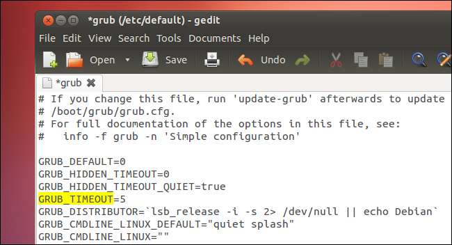 For å endre denne innstillingen, åpne / etc / default / grub-filen i et tekstredigeringsprogram: