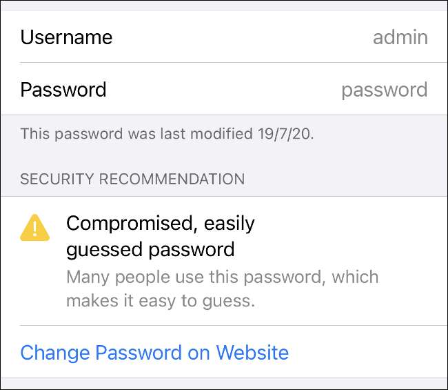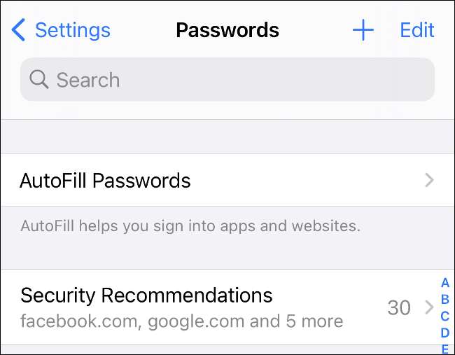 Din iPhone kan nå varsle deg hvis din passord har blitt kompromittert eller er enkle å gjette ved hjelp av det innebygde verktøyet for lagring av passord. Gå til Innstillinger> Passord for å se en liste over lagrede passord. Trykk på “Sikkerhetsanbefalinger” for å se kjente problemer.