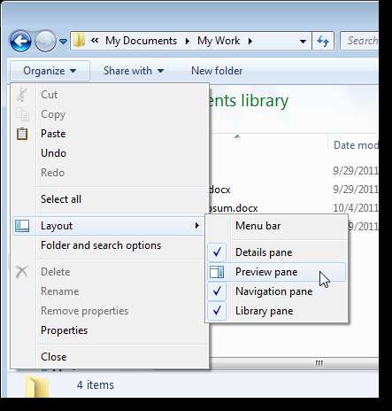 Når du blar gjennom mappene og filene dine i Utforsker, kan det være nyttig å kunne se innholdet i filene uten å åpne filene og å se detaljer om filene. Forhåndsvisning-ruten og Detaljer-ruten lar deg gjøre dette. For å slå på en eller begge disse rutene, klikk Organiser i Utforsker-vinduet og velg Oppsett for å vise en undermeny. Hvis en rute på undermenyen har en hake ved siden av, vises den for øyeblikket i Utforsker. Slå rutene på og av ved å velge dem i undermenyen. Du kan også trykke Alt + P for å slå forhåndsvisningsruten av og på.