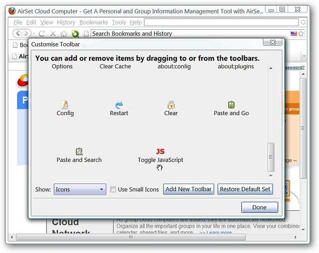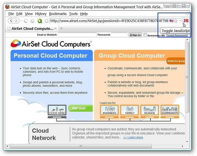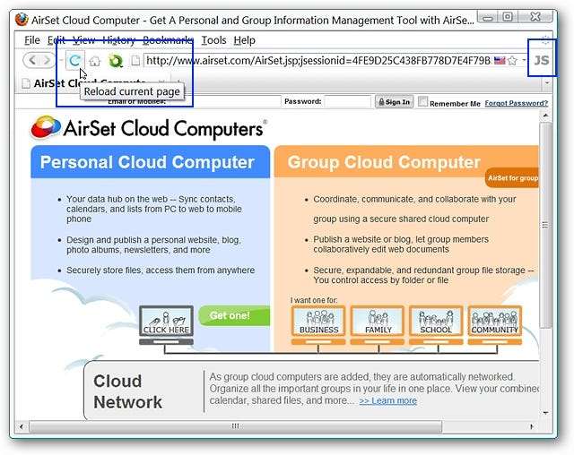 Hvis du allerede har en webside lastet inn som i eksemplet vårt, trenger du bare å oppdatere den aktuelle siden. Inntil du aktiverer JavaScript på nytt, blir JavaScript deaktivert på alle nettsider du surfer på. Legg merke til den grå fargen på "Toolbar Button" ...
