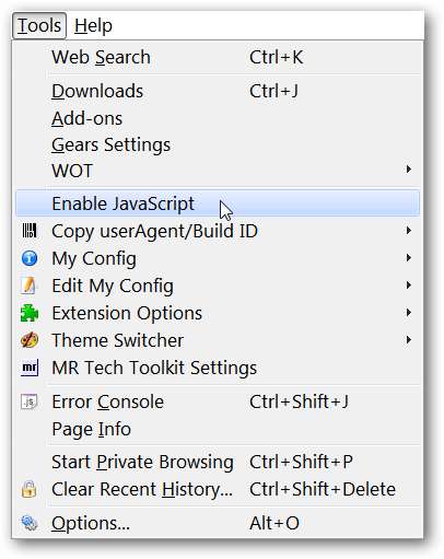 Hvis du aktiverer alternativet "Verktøy-meny", vil det være en entalloppføring som vil ha en hake ved siden når JavaScript er aktivert.