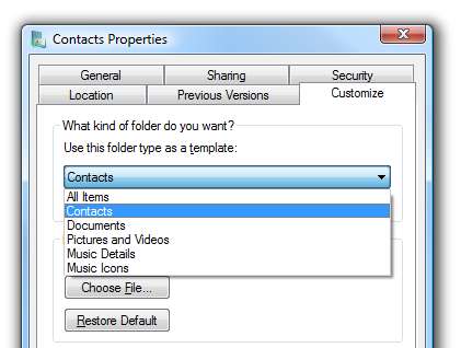 Nå fra kategorien Tilpass, endrer du "Bruk denne mappetypen som mal" til Kontakter i stedet for Bilder, eller hva den var satt til.