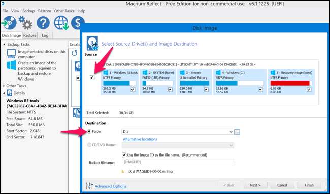 Deretter klikker du på "Lag et bilde av partisjonen (e) som kreves for å sikkerhetskopiere og gjenopprette Windows" i hovedvinduet i Macrium Reflect. I Disk Image-vinduet som dukker opp, må du kontrollere at hele disken er merket av under "Source" - du vil ikke gå glipp av noen av disse partisjonene. Under Destination velger du din ekstra harddisk som "Mappe".