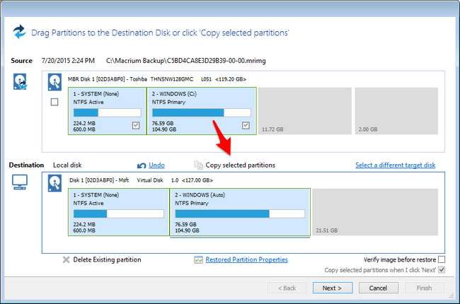 Bruk "Kopier valgte partisjoner" for å kopiere partisjonene fra bildet ditt tilbake til disken. Til slutt klikker du “Neste” og går gjennom veiviseren. Macrium Reflect gjenoppretter bildet ditt og overskriver Windows 10 med den opprinnelige Windows-installasjonen.