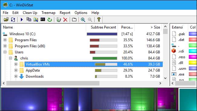 For å jakte på hva som faktisk bruker plass på datamaskinen din, må du installere en diskplassanalysator som WinDirStat . Dette verktøyet skanner harddisken din og viser deg en grafisk fremstilling av hva som bruker plass på datamaskinen din, og sorterer mapper og filer fra de som bruker mest plass til minst. Dette fungerer som Disk Analyzer-verktøyet i CCleaner, men med et bedre grensesnitt som gjør det lettere å se hva som bruker plass.