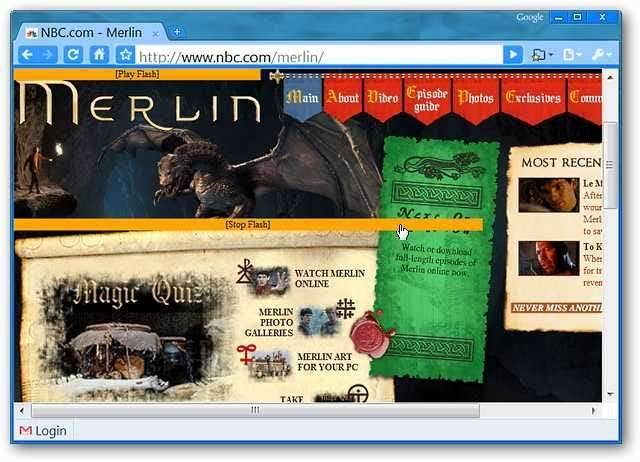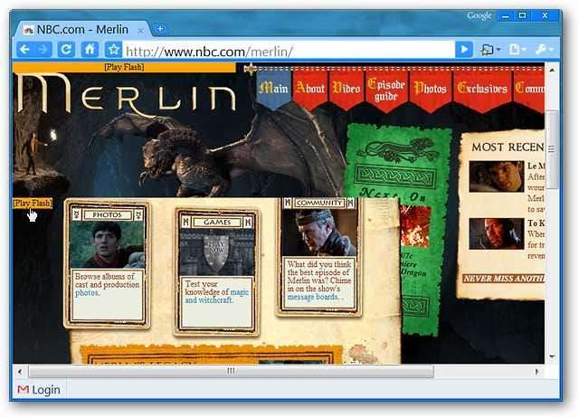 Hvordan ser det ut etter å ha satt opp brukerskriptet? Vi bestemte oss for å besøke NBCs Merlin-nettsted for vårt eksempel. Som du kan se, vises to blitzelementer som skjulte og er utpekt av de gule tekstboksene. For å få tilgang til et skjult flash-element, klikk på “[Play Flash]” ...