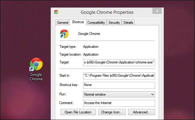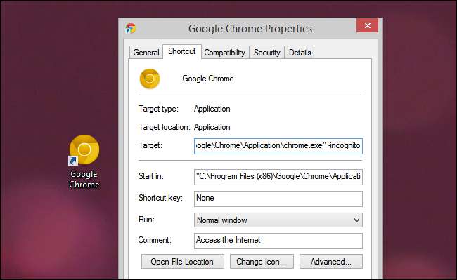 Ved å legge til kommandoen Chrome-snarveien bruker, kan vi enkelt fortelle den å starte i inkognitomodus. (Og for andre lesere som følger hjemme, kan vi gjøre det samme med andre nettlesere som Firefox).