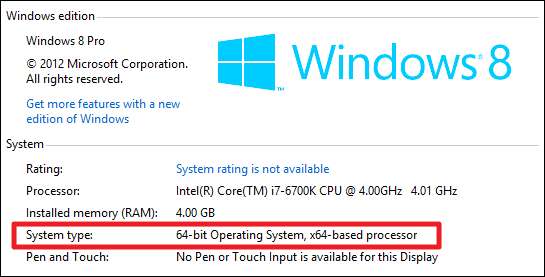 Hvis du kjører Windows 8, går du til Kontrollpanel> System. Du kan også trykke Start og søke etter “system” for å finne siden raskt. Se etter "System type" -oppføringen for å se om operativsystemet og prosessoren din er 32-biters eller 64-biters.