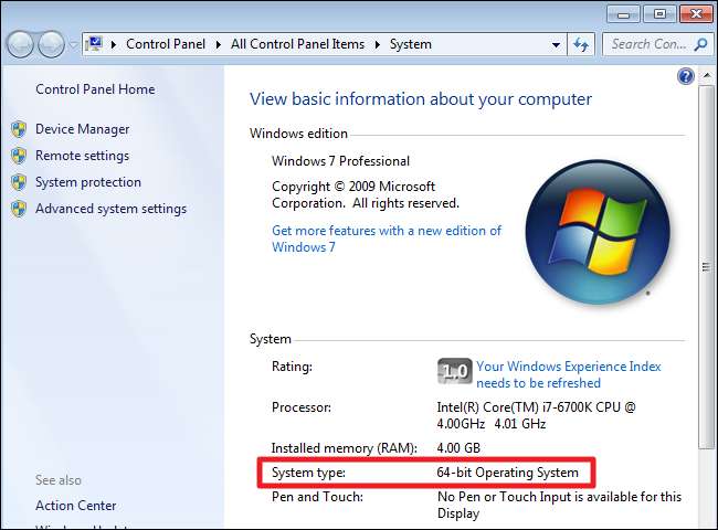 På "System" -siden, se etter "Systemtype" -oppføringen for å se om operativsystemet ditt er 32-biters eller 64-biters. Vær oppmerksom på at, i motsetning til i Windows 8 og 10, viser ikke "Systemtype" -oppføringen i Windows 7 om maskinvaren din er 64-biters.