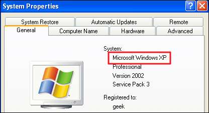 I vinduet Systemegenskaper, gå til “Generelt” -fanen. Hvis du kjører en 32-biters versjon av Windows, vil den ikke si noe annet enn "Microsoft Windows XP." Hvis du kjører en 64-biters versjon, vil den vises i dette vinduet.