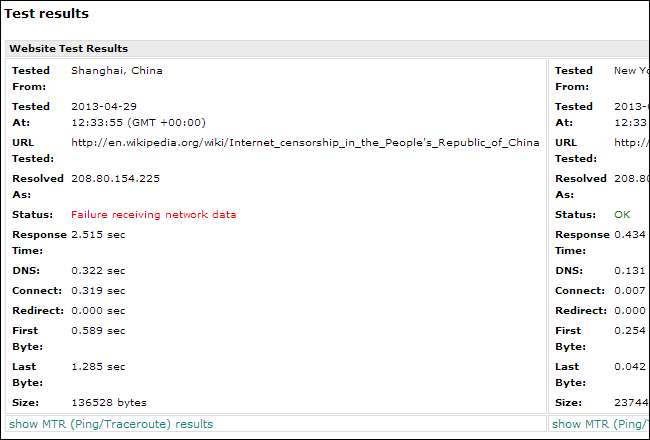 - Analyse og filtrering av nettadresser : Brannmuren kan skanne URL-er og blokkere forbindelser hvis de inneholder sensitive nøkkelord. For eksempel, Nettstedspuls viser oss at http://en.wikipedia.org er tilgjengelig fra Kina, men http://en.wikipedia.org/wiki/Internet_censorship_in_the_People's_Republic_of_China er ikke tilgjengelig - brannmuren ser på URL-en og bestemmer seg for å blokkere nettet sider som ser ut til å handle om sensur på Internett.