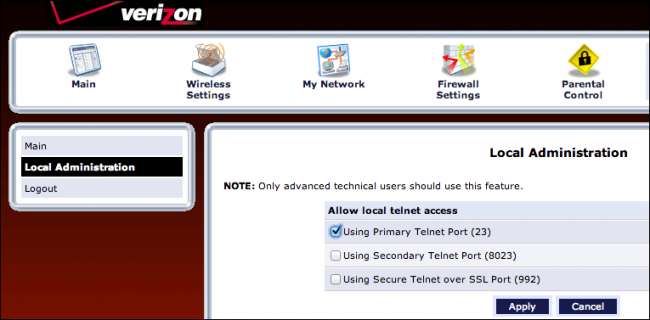 Det første du vil gjøre er å finne ut hvordan du aktiverer telnet på ruteren. For Verizon-ruteren kreves det å gå inn i Advanced -> Local Administration og sørge for at "Using Primary Telnet Port" er aktivert. Sørg for å klikke Bruk.