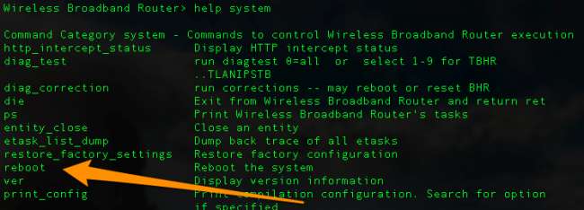 Når du er der, kan du vanligvis skrive inn hjelpekommandoen for å se hva alternativene er. For Verizon FIOS var alternativet jeg lette etter i systemunderseksjonen, og hadde passende tittelen "omstart". Du må faktisk skrive "systemstart" og ikke bare "starte på nytt".