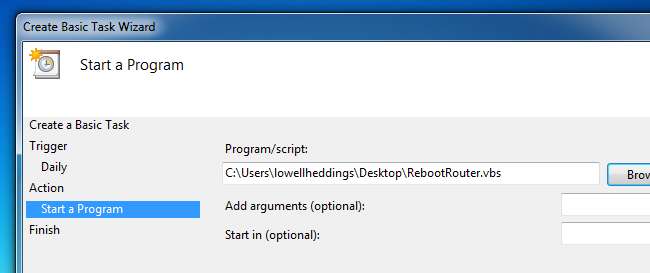 Åpne oppgaveplanleggeren og opprett en ny grunnleggende oppgave, og gi den et navn og en tidsplan - daglig på et bestemt tidspunkt vil fungere. Bruk deretter alternativet Start et program og bla til skriptfilen du har opprettet.