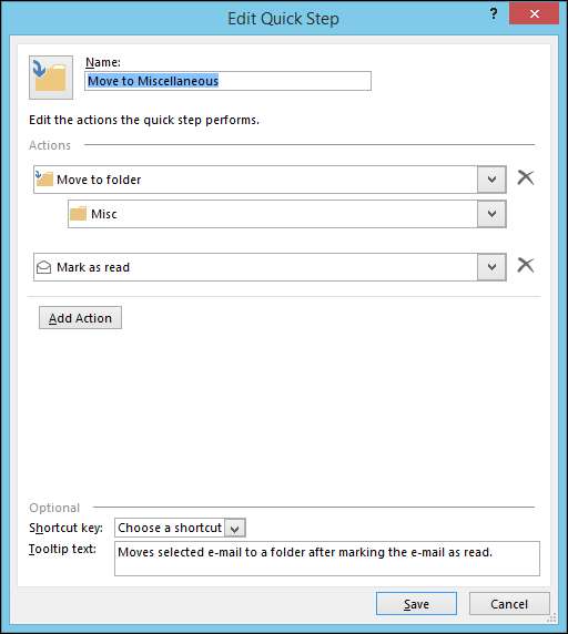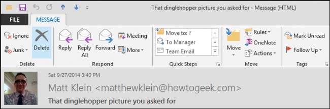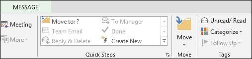 Outlook har en mengde funksjoner innebygd for å hjelpe deg med å filtrere e-posten din på de riktige stedene. Til å begynne med, hvis du høyreklikker på en melding eller mus opp til båndet, vil du legge merke til at det er en funksjon som kalles raske trinn.