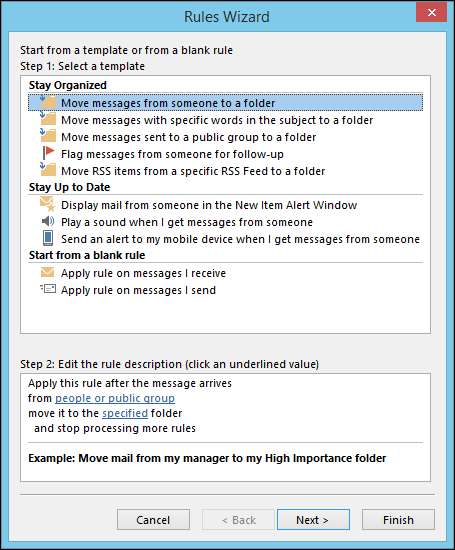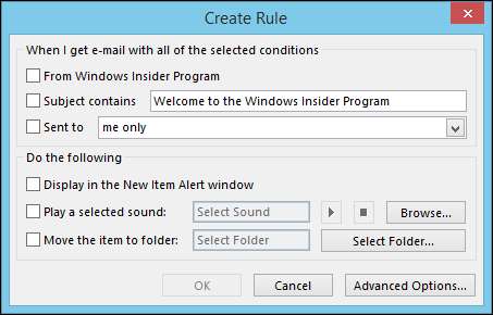 I det følgende bildet ser du at du kan dirigere e-post fra bestemte avsendere, eller basert på emnet, eller til hvem den blir sendt. Derfra kan du få Outlook til å varsle deg visuelt og / eller med en lyd. Du kan også flytte meldingen til en bestemt mappe, som i motsetning til å bruke et raskt trinn, ville skje uten innspill.
