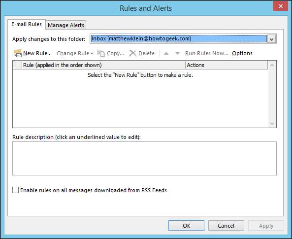 Som vi nevnte, er Quick Steps noe du handler på mens Regler fungerer automatisk bak kulissene, i henhold til kriteriene du spesifiserer. Når du klikker på "Regler" -knappen, bør du velge "Opprett regel ..." fra rullegardinlisten.