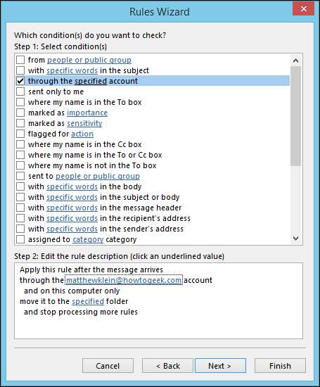 Tenk deg så tar vi Quick Step vi opprettet tidligere og vil gjøre det om til en regel. Vi ønsker å velge kriteriene våre fra alternativene som vises ovenfor, og deretter klikke "Neste". I dette tilfellet skal vi flytte e-post som sendes til How-To Geek-kontoen vår.