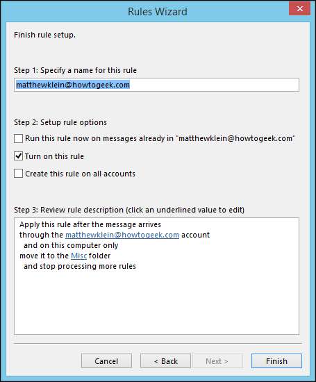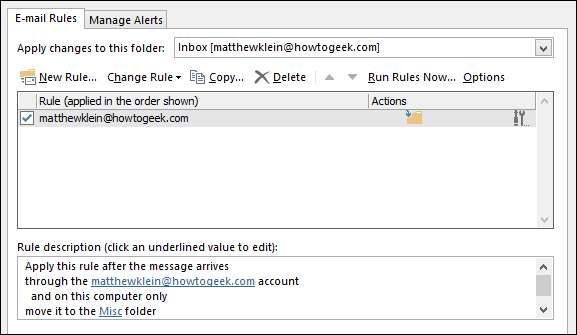Det er det, klikk "Fullfør", så er du klar. Du kan se denne regelen ved å klikke på "Regler" -knappen og deretter "Behandle regler og varsler" fra rullegardinvalgene.