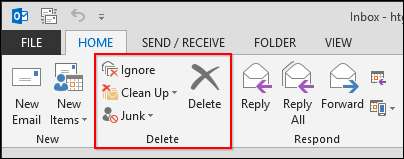 Som du kan se fremtredende vises på båndet, er det en del som er helt viet til å slette ting, mest bemerkelsesverdig er den store "Slett" -knappen og dens gigantiske X. Du kan også bare velge en melding eller gruppe med meldinger og klikke på den knappen eller bare trykk på "Slett" på tastaturet.