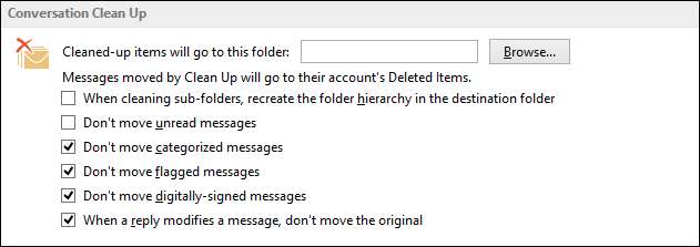Hvis du klikker på “Innstillinger” -knappen, blir du visst til alternativene for samtaleopprydding. Som du kan se, kan du bruke Clean Up-funksjonen til å arkivere gamle, overflødige samtaler til en alternativ mappe, som sannsynligvis er det mest nyttige alternativet her. Det er ofte bedre å bare arkivere ting i stedet for å slette det, bare i tilfelle du trenger å henvise til det på et senere tidspunkt.