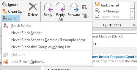 Poenget er at spam fremdeles skjer, men Outlook gir deg måter å forhåpentligvis holde den i stor grad under kontroll med søppelfiltre. Når du mottar en melding som er tydelig søppel eller spam, kan du velge den meldingen og deretter klikke "Søppel" -knappen for en rullegardinliste med alternativer. For uønskede meldinger velger du "Blokker avsender", men for alt annet, vil du justere søppelpostalternativene.