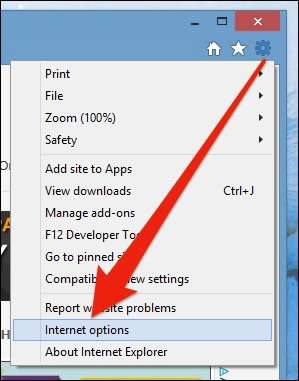 Først er den siste og siste versjonen av Internet Explorer. For å slå på tredjeparts blokkering av informasjonskapsler, klikk på tannhjulikonet øverst til høyre, og klikk deretter på “Alternativer for Internett” fra rullegardinlisten.