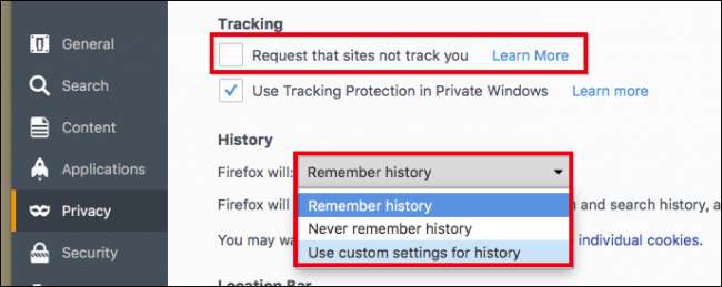 Når innstillingene er åpne, må du merke at det er et alternativ å slå på Firefox's Do Not Track-alternativ. Klikk på "Husk historikk" under sporingsinnstillingene, og velg deretter "Bruk egendefinerte innstillinger for historikk".