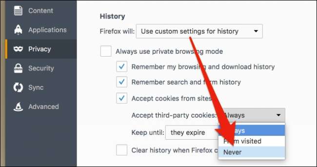 Klikk på rullegardinlisten ved siden av "Godta tredjeparts informasjonskapsler" fra skjermbildet for tilpasset historikk, og velg deretter "Aldri".