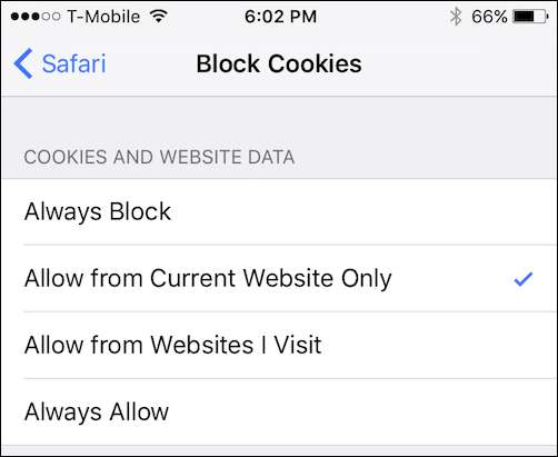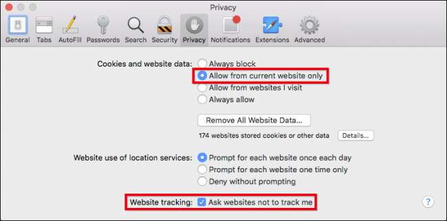 Når innstillingene er åpne, klikker du på "Personvern" -fanen, og deretter under "Informasjonskapsler og nettsteddata" klikker du på "Tillat bare for gjeldende nettsted". Nederst i kategorien Personvern er det også et alternativ for å slå på Safaris Do Not Track-funksjon.