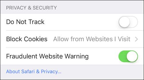 På Safari-preferanseskjermen, bla til alternativene "Personvern og sikkerhet". Her vil du se Safaris Do Not Track-funksjon og alternativet "Block Cookies".