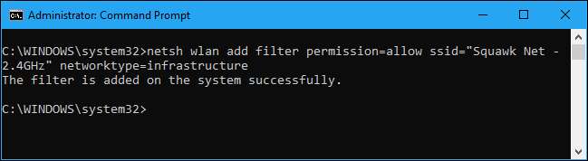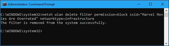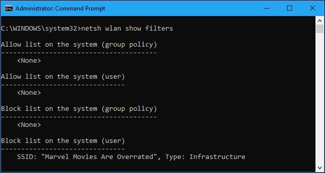 Gjenta denne prosessen for å legge til flere nettverk til Wi-Fi-svartelisten din, hvis du vil. Denne kommandoen filtrerer basert på nettverksnavnet. Så hvis naboen gir nytt navn til Wi-Fi-nettverket, ser du det nye navnet vises i Wi-Fi-listen din.