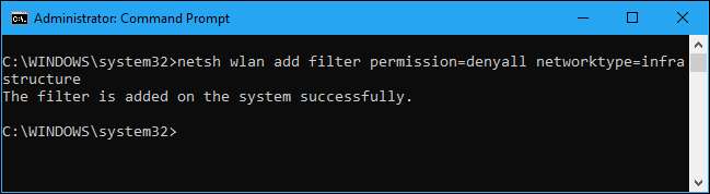 netsh wlan legg til filtertillatelse = nekte nettverkstype = infrastruktur