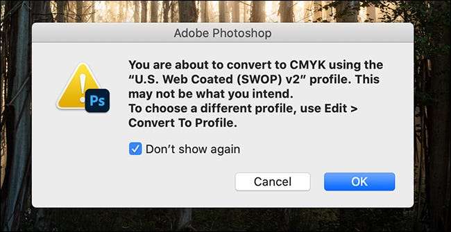 For eksempel, Endre fargeplassen på bildene dine dypt påvirker hvordan de ser om du legger dem på nettet eller Skriv ut dem ut , uten å virkelig endre det du ser i Photoshop. Noen ganger vil du virkelig endre fargeplassen på arbeidet ditt, men det er også noe du kan gjøre ved et uhell, spesielt hvis du kombinerer flere bilder fra forskjellige kilder. Endring av fargeplassen eller kombinere bilder fra forskjellige fargeplasser er den typen ting du sannsynligvis vil se en popup om hver gang du gjør det.