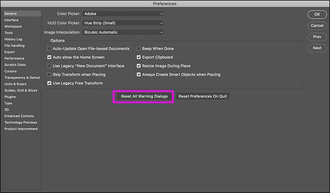 For å gjenopprette Photoshops advarselsdialoger på en Windows-PC, gå til Rediger & GT; Preferanser. Velg Photoshop & GT; Preferanser & gt; Generell.