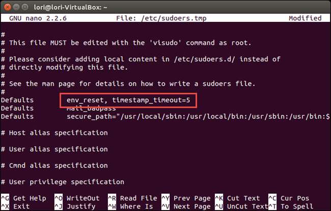 Erstatt “x” med antall minutter du vil at sudo skal vente i samme terminaløkt før du blir bedt om å skrive inn passordet ditt igjen.