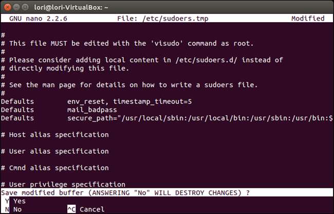 Når du har gjort endringen, trykker du på Ctrl + X og skriver inn et “y” som svar på spørsmålet som vises nederst i vinduet for å lagre endringene.