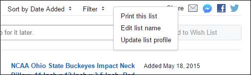 Hvis du klikker på "Ønskeliste" -linken, tar den deg til siden din. Du ser at vi kan sortere varer etter dato og pris, filtrere varer og bruke listehandlinger som å skrive ut eller redigere det. Hvis du vil dele ønskelisten din, er det også muligheter for det.